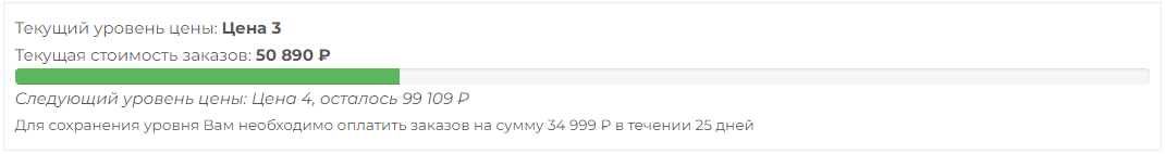 Для поддержания соответствующего уровня скидок в личном кабинете Вам необходимо поддерживать определенный объем заказов в течении 30 календарных дней. В таком случае соответствующий размер скидки будет сохранен в последующем периоде.
